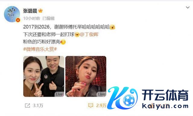 昨天夜里 11 点多,不少网友的微博推送陡然被张碧晨 "砸" 了一下 —— 这位泛泛专注唱歌的歌手,苦楚晒出两张相片,配文直白又吵杂:" 2017 到 2026,谢谢师父托举哈哈哈哈哈哈 [ 比耶 ] 下次还要和敦厚沿路打球,@丁俊晖 粉色的巧粉好漂亮"。