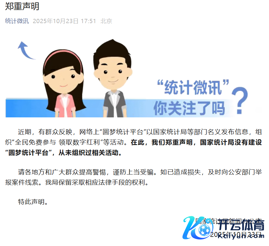 国度统计局珍藏声明:从未组织过“圆梦统计平台”关系动作开云体育(中国)官方网站国度统计局珍藏声明:从未组织过“圆梦统计平台”关系动作